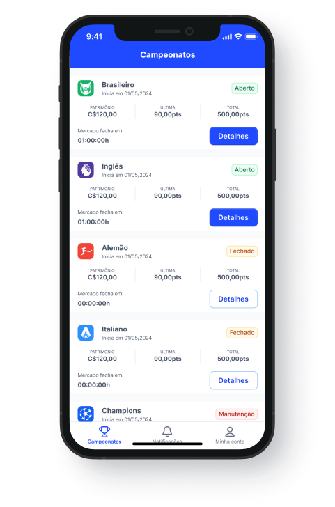 Escolha qual campeonato você deseja jogar e monte o time dos sonhos com os melhores jogadores do mundo.
